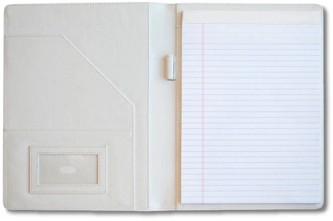 - Full pad of 8.5″ x 11″ paper, pen holder, and business card holder inside